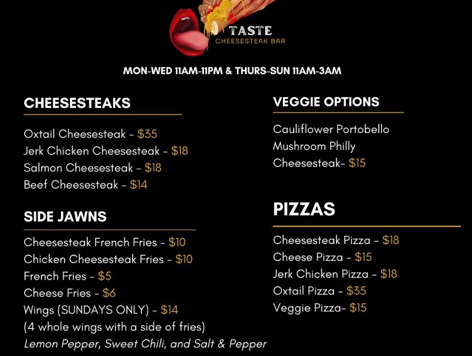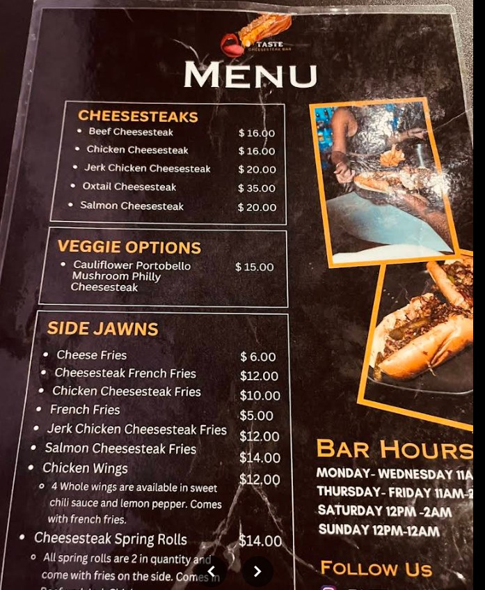 First off, I would give this a 7 out of 5 stars if you would allow me. Now: Let's Get Busy! To my fabulous waitress Naomi: Thanks for the EXCELLENT and professional service! I told you I would give a shout out. You deserve it! Food: People of all walks of life, aliens, and creatures of the sea, you have to go to TASTE. Their cheesesteaks will stop you from hitting those tourist traps and feeling "Mediocrerized". I personally had the Jerk Chicken Cheesesteak and I will never, ever share mine, even though it is huge! Mine, ALL mine! SPicy, tantalizing, insatiable to your palate. ( For transparency, I am allergic to onions, so mine came without ) The combination of all their ingredients will take you an erogenous zone, if you know what I mean. My son ordered the basic beef cheesesteak, but DAMN: it was not ordinary, but extraordinary! He is a student at PENN and he will now be a forever customer. THe sauce they use, the tender beef had him salivating! Yes, this is a Black Owned business and I am happy to say, it earns all the kudos and stars, not because of Blackness, but excellence! People of all walks of life, creeds and religions were there when we arrived. We observed people leaving the bar area with smiles, the crew was smiling and you will be too......